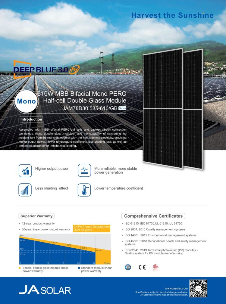 JA Pro JAM78D30GB 585W-610W Mono-facial PERC Mono Half Cell Solar Panel